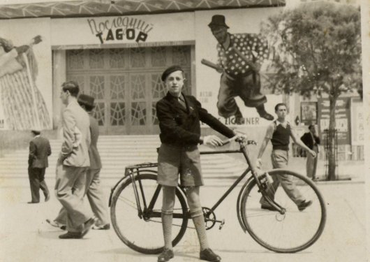 עומד בחזית קולנוע מוגרבי על אופניו החדשים, רגליו ההורסות – עד היום – והברט.